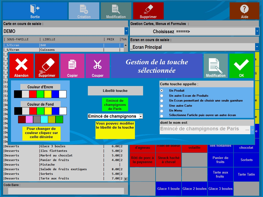 • Pas de contrainte d'organisation, une touche peut aussi bien appeler un produit, un sous-écran, une autre carte, des commentaires cuisines, des garnitures ... C'est la liberté !