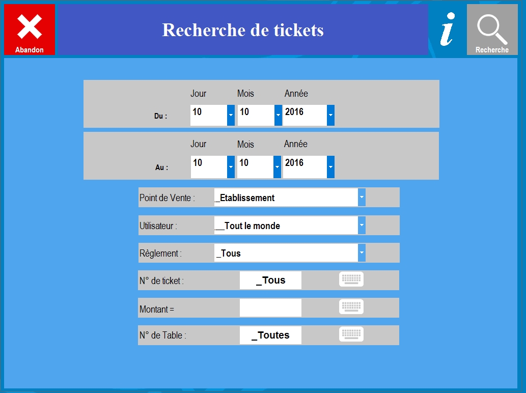 • Possibilité de rappeler n'importe quel ticket encaissé avec 10 critères de choix